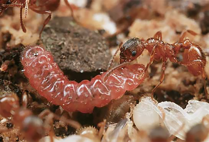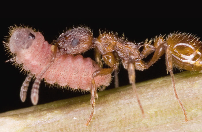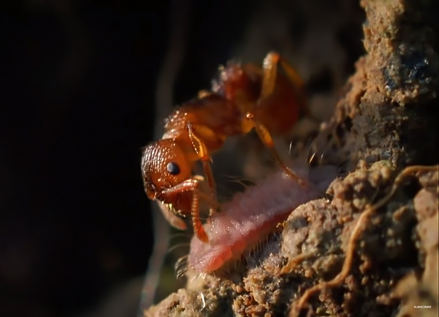 Так что же с муравьями не так? Зачем они тратят пищу, предназначенную для их детишек, на гусениц? А дело в том, что они как раз и считают гусениц одними из своих детишек. Эти обманщицы выделяют секрет, который заставляет их пахнуть как личинки муравьёв, и те заботятся о юных голубянках как о собственных чадах, не замечая самого страшного.