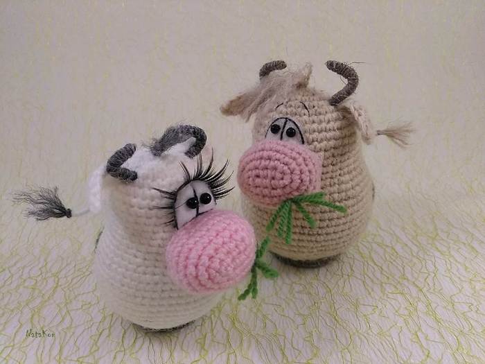 Бычки и коровки связаны крючком из пряжи .Имеется клеймо НИФИ ( Научно - исследовательский Финансовый институт)
