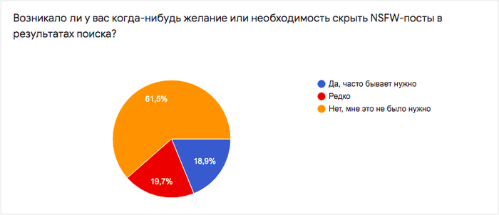И остался достаточно спорным вопрос об отображении результатов поиска в мобильной версии сайта. Мы предложили показывать там не только посты, но и пользователей / сообщества / теги. Так, как сейчас это происходит на десктопе. И здесь подавляющее большинство разделилось. 44% не испытывают в этом необходимости, а вот 30% часто сталкиваются с неудобством.