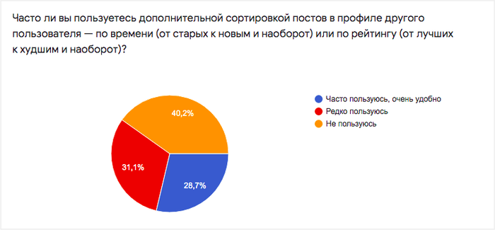 40% вообще не пользуются сортировкой постов в чужом профиле, 31% пользуются ей редко.
