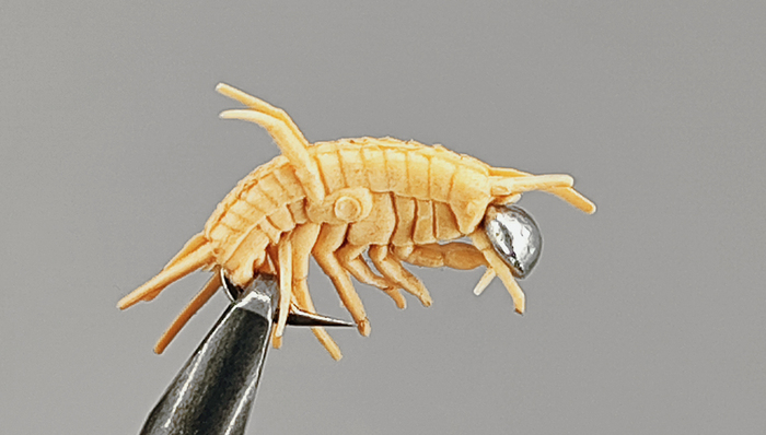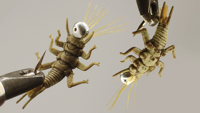 Крючок: Maruto 7023BR. Головка: бисер Toho. Монтажная нить: UNI thread. Утяжеление: свинцовая проволока. Усики и церки: ость пера золотого фазана. Тело и ножки: даббинг из медвежей шерсти, нить шерстяная, пленка ПВХ. Трахейные жабры: овечья шерсть, люрекс.