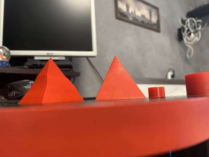 Первая печать мягко говоря разочаровала, слои в начале моделей съехали, причины этого сбоя были непонятны. Одна из рассматриваемых мной тогда причин - дефект модели. Чтобы проверить эту теорию было решено смоделировать примитивные фигуры в онлайн программе Tinkercad. После слайсинга они тоже ушли в печать.