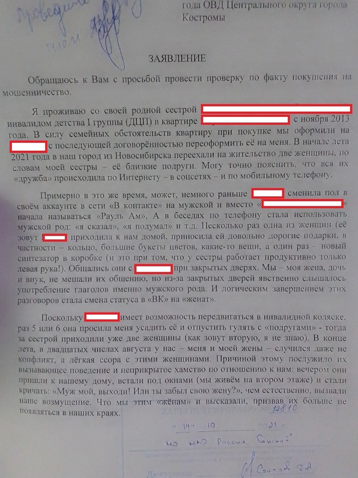 Про меня распускают слухи о том, что я хочу заставить Рауля переписать квартиру на меня; что я совратила бедную-несчастную инвалидку 50 годиков от роду; что я держу ее на препаратах... в общем, прикрепляю заявление в полицию от Б, можете поржать над уровнем обвинений :)