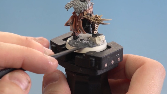 Для оформления подставки возьмём серую текстурную пасту Astrogranite. Темноватый холодный асфальтовый оттенок выгодно оттенит тёплые тона модели