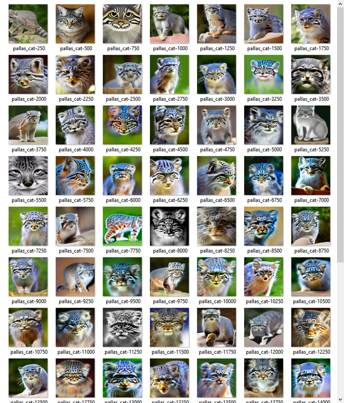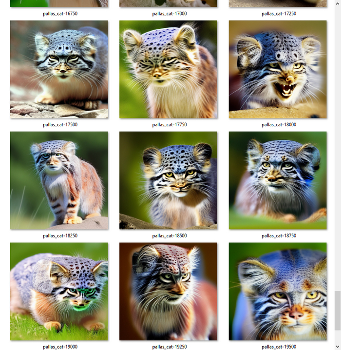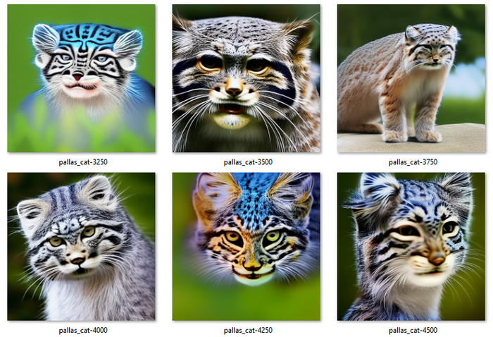 Пришёл к выводу что для обучения "что такое манул" нейросетке дал мало "памяти". Просто когда проводится такая вот тренировка для отрисовки нового объекта или стиля рисования, генерируется крошечный файлик, от нескольких килобайт, который называют "embedding" ("вставка"). Там просто пачка чисел. И вот когда в запросе на генерацию картинки использует название этого файла, числа загружаются, но вот их количество определяет, сколько информации туда можно впихнуть. А задал я по минимуму. Но вот нейросетке и не очень получается привести к общему знаменателю.