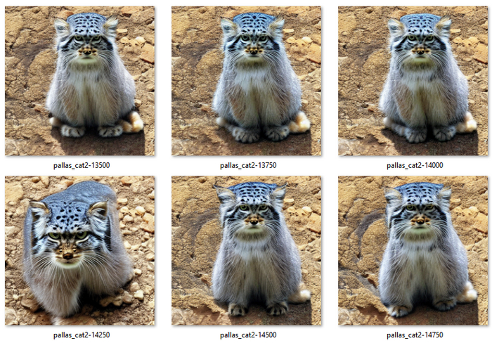 Нейросетка берёт за основу кота и пытается из него лепить манула, проходя через несколько фаз создания странных зверушек и енота. Дальше я меняю стиль тренировки и замедляю его, глядя на одну и ту же картинку. И там ничего интересного не происходит.