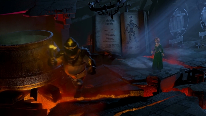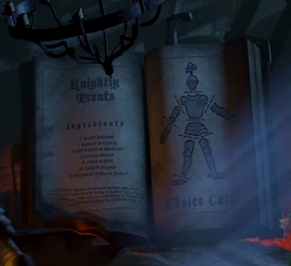 Раскрытая кулинарная книга драконьего размера, раскрытая на странице с рецептом "Knightly treats" (Вкусняшки по-рыцарски) и схемой разделки рыцаря "Choice cuts" (Отборные кусочки). Драконица, оказывается, тот еще гурман.