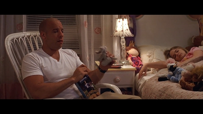 Судите сами: лысый вояка, не знающий другой жизни, кроме армии, вынужден общаться с детьми, сначала строит их по-армейски, но в процессе понимает ценность семейных отношений и в конце уходит из армии. А в середине рассказывает на ночь сказку, постепенно переходя на собственные воспоминания. Разве что у ПТСР-нутого на всю голову Пейна сказочка про паровозик, который смог, получилась более эпичной.