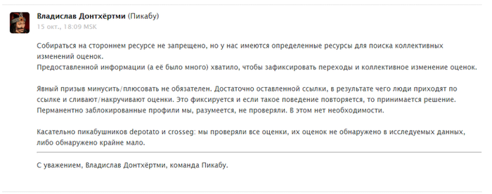 Мы же, люди упомянутые и причастные к этому чату, ничего не скрывали - мы честно дали полный список находящихся в чате со ссылками на наши аккаунты и попросили разобраться. Потому что ни к какой скрутке и/или накрутке рейтинга мы не призывали.