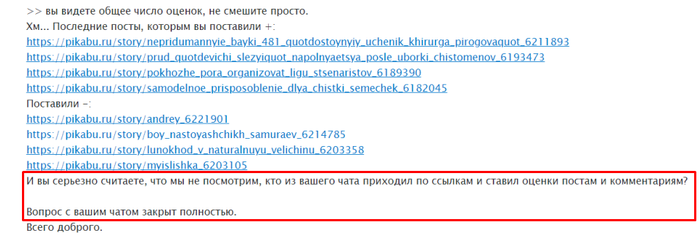 3) Попытки поговорить с саппортом, зная что накруток/скруток с нашей стороны быть не могло, отправка полного списка ссылок, ведущих на Пикабу, собранных за неделю (напоминаю - чату меньше месяца), а так же скидывание полного списка участников чата в саппорт и приглашение присоединиться модератору к чату, если остались сомнения, привели к ещё бОльшему количеству пользователей, которые получили ограничения.