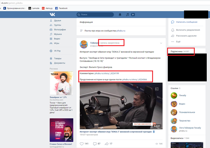 Но при этом спокойно существуют группы в контакте, некоторые из которых выкладывают эти самые ссылки, а там отнюдь не 2-3 десятка участников. Или как пример - в группе по играм, с 94 тысячами подписчиков, обсуждаются околополитические темы, к тому же, сообщение с этими темами и ссылками на них закреплена: