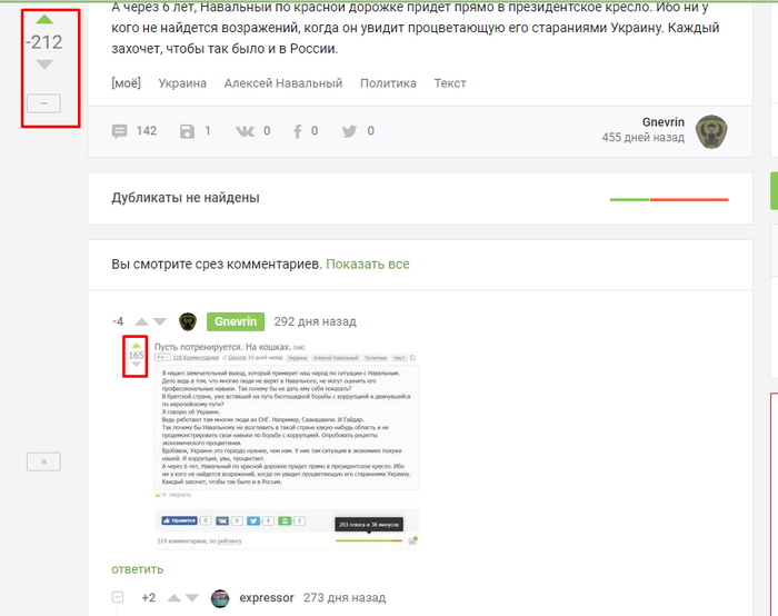 А вот так выглядят результаты реального набега, когда рейтинг поста спустя 10 дней после публикации +165, а ещё через пару-тройку недель уже -212: