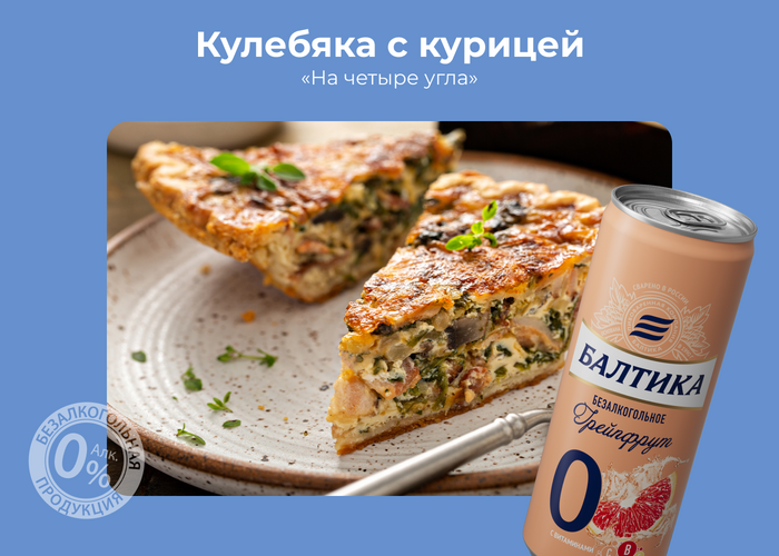 Для эффектной подачи преподнесите кулебяку на деревянном блюде. А безалкогольный напиток Балтика 0 Грейпфрут поможет вкусу пирога раскрыться благодаря легкой кислинке и фруктовому аромату.