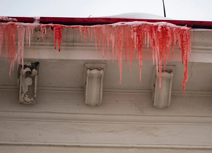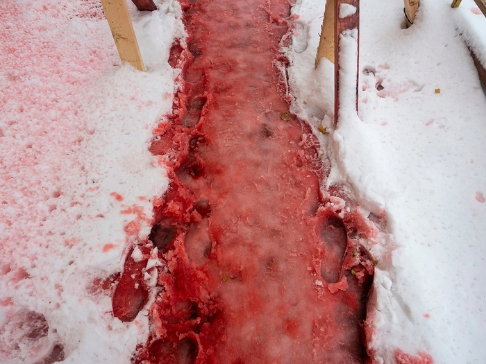 Результат на фото: "кровавые" сосульки и тропинка под ними.