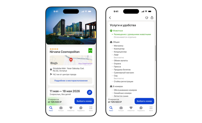 В поисках баланса мы много экспериментируем. Например, если вы путешествуете с питомцами, блок «Можно с животными» появится сразу под названием отеля и выделится зелёным. Если с детьми — наверх выедут условия проживания и типы кроватей. Страница загружается поэтапно: сначала фото и ключевая информация, потом — отзывы и детали. Это позволяет открывать её за секунду, даже если данных много.