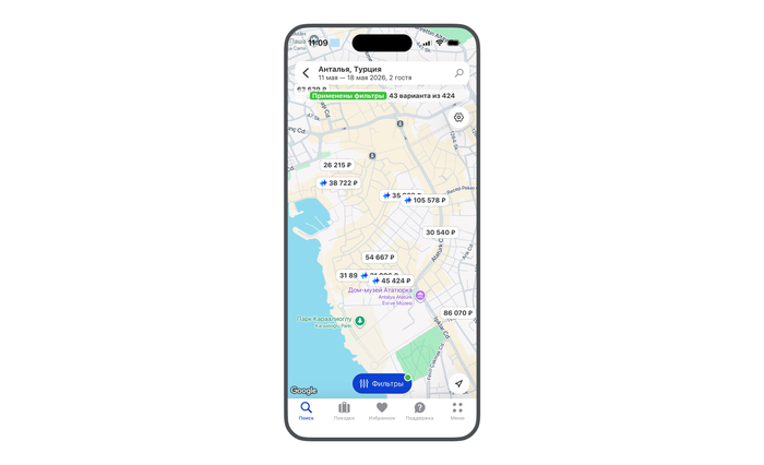 В результате поиска вы получаете выборку вариантов размещения. Видеть их можно не только списком, но и на специальной карте. На первый взгляд — ничего особенного: точки, отели, цены. Но технически это один из самых сложных элементов приложения.