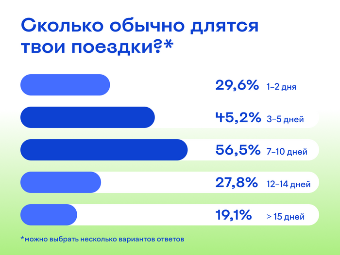 Хотя длительные поездки и помогают устроить тотальную перезагрузку, сотрудники Островка путешествуют не только во время ежегодного отпуска. На втором месте по популярности оказались поездки от трёх до пяти дней, а на третьем — двухдневные вылазки, например, на выходные. Такой формат позволяет сменить обстановку, получить новые впечатления и при этом не выпасть из рабочих процессов. Впрочем, и от длительных путешествий сотрудники не отказываются: поездки от 15 дней оказались на четвёртом месте по популярности.