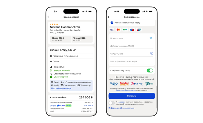 Поздравляем, вы уже в форме бронирования! Авторизация, ввод данных, оплата — и бронь готова. На этом же шаге можно активировать промокод (мы часто ими делимся в имейл-рассылках и в Telegram-канале) или воспользоваться нашей программой лояльности «GURU».