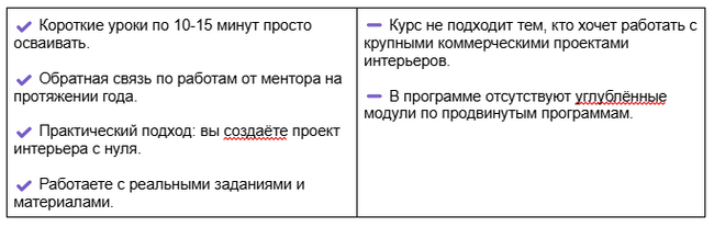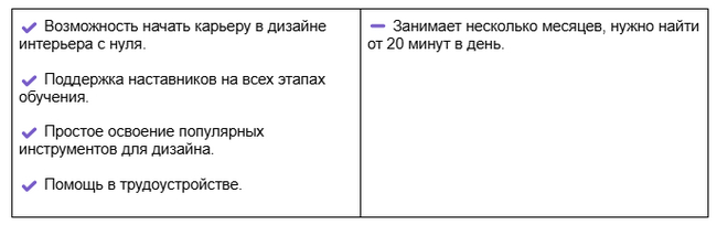 ➖ Множество материалов и программ, требующих усердия для освоения дизайна интерьера.