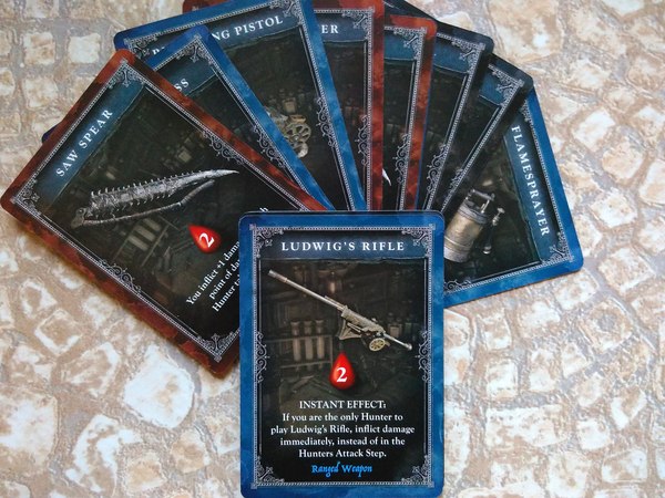 2) 5 стартовых карт (2 карты ближнего оружия, 1 пушка, карта трансформации и карта сна охотника)