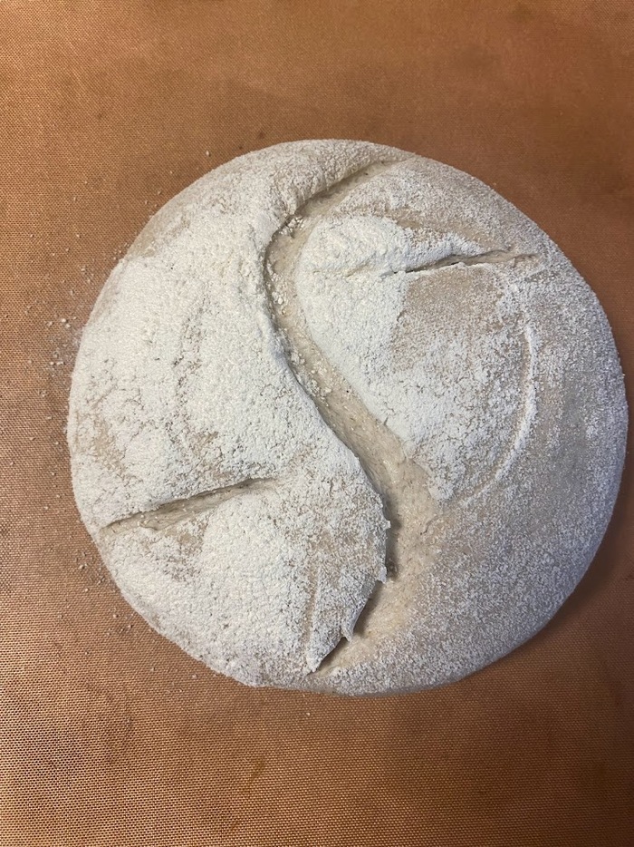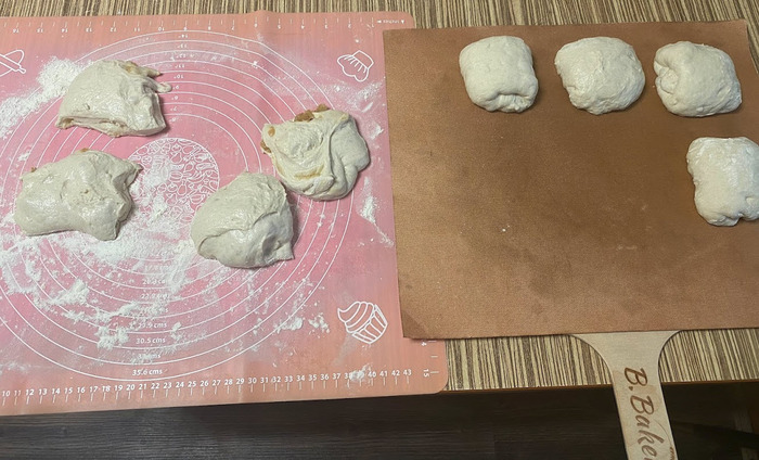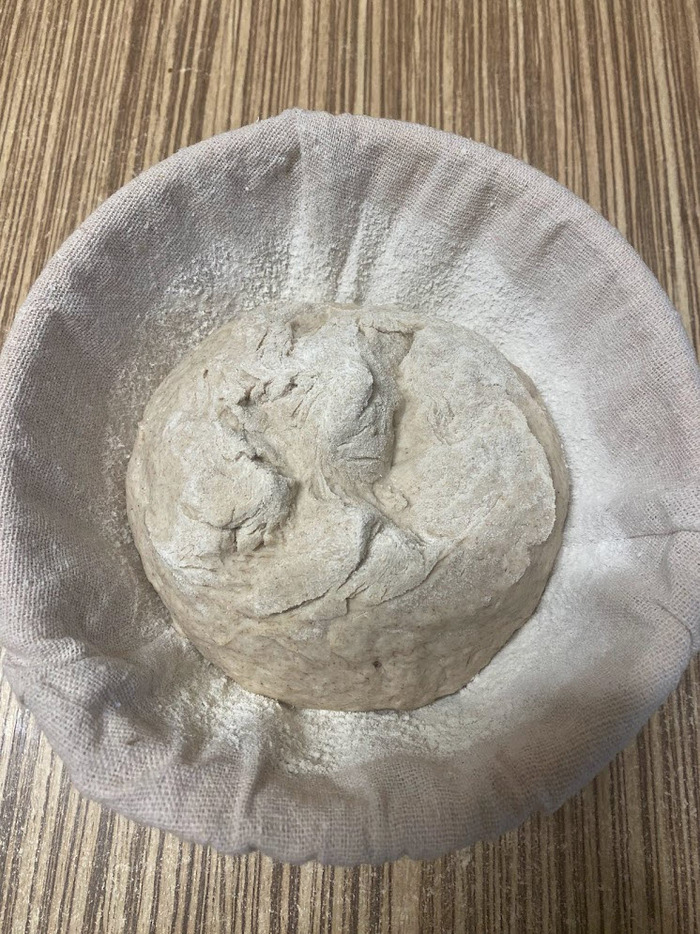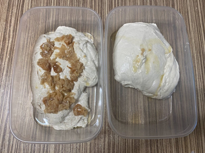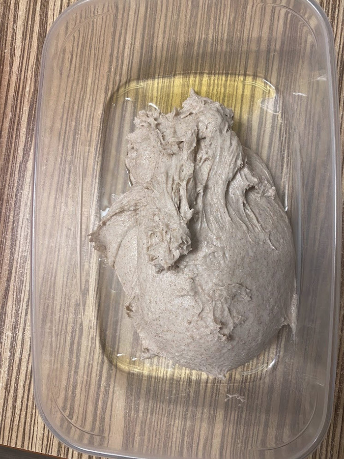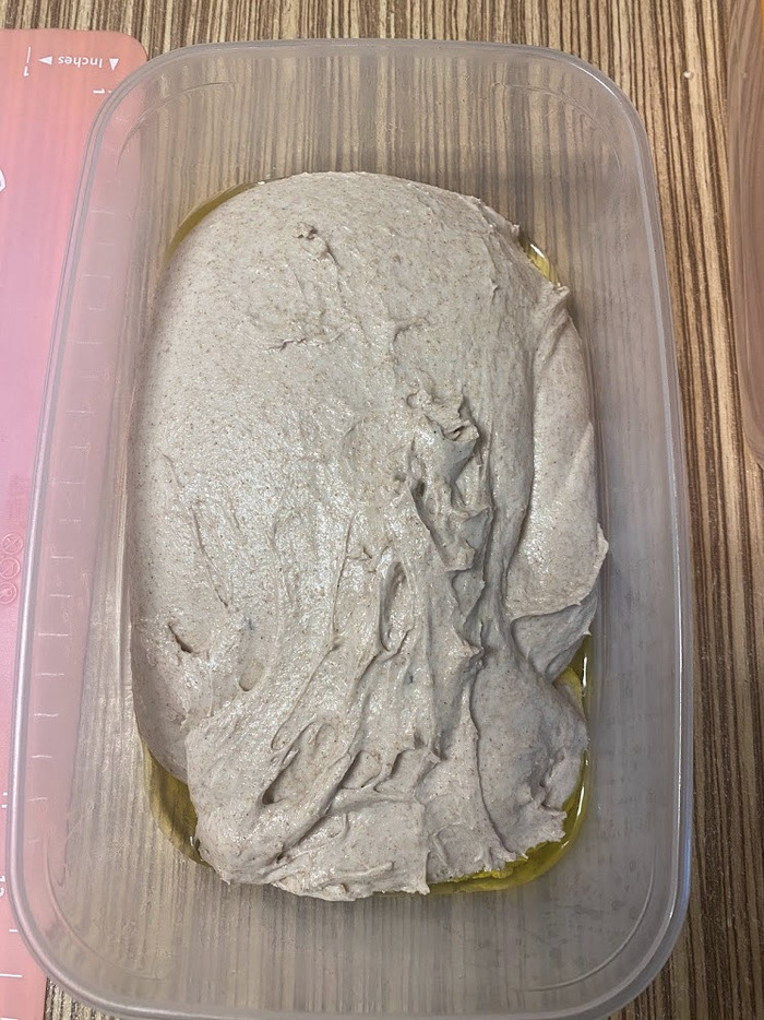 Замесить тесто до гладкости. Переложить в емкость смазанную маслом. Брожение 3 часа, с складыванием каждый час ( всего 2 складывания)