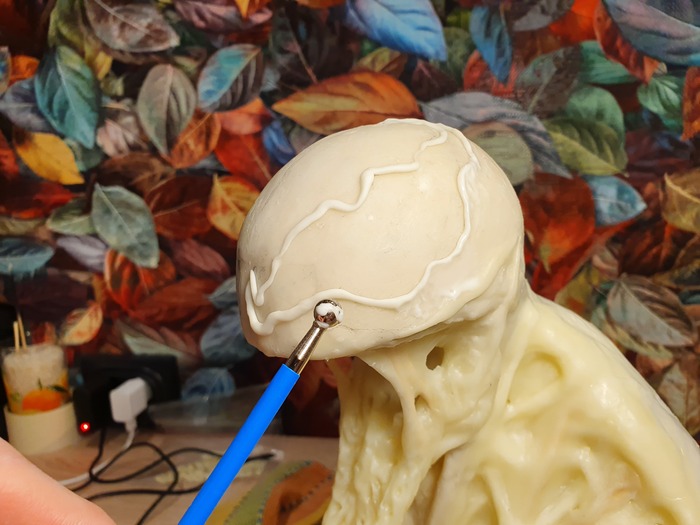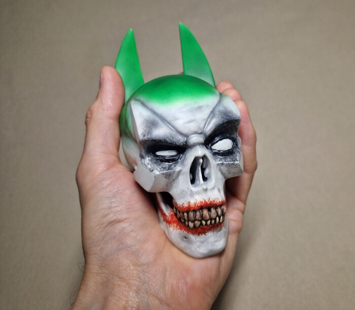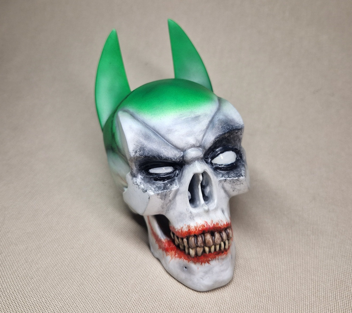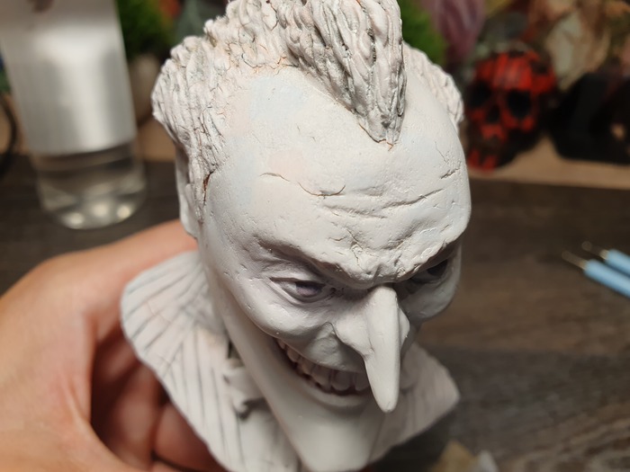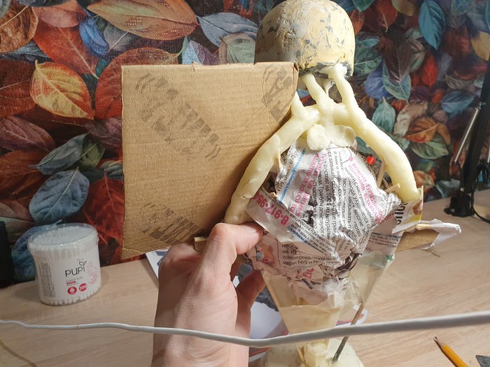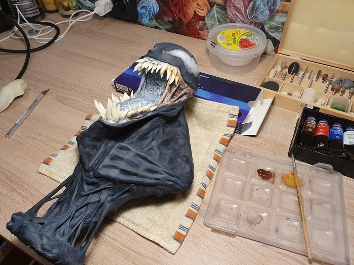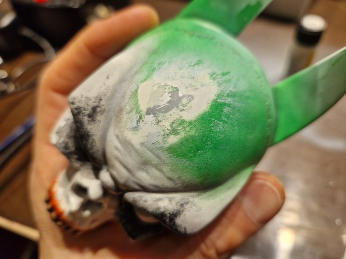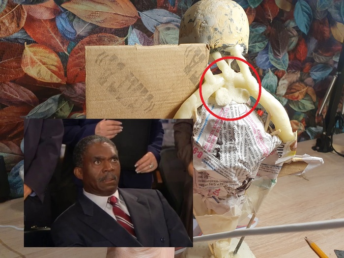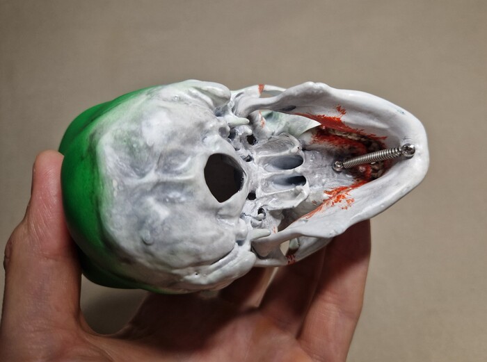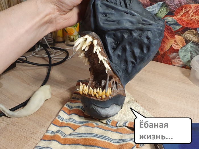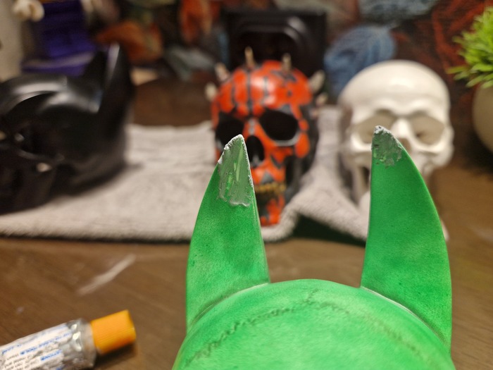 Когда работа была уже совсем закончена, а сама черепушка дожидалась фотосессии в гримёрке, одно усатоволосатое недоразумение свалило её на пол.