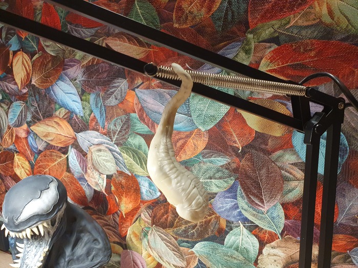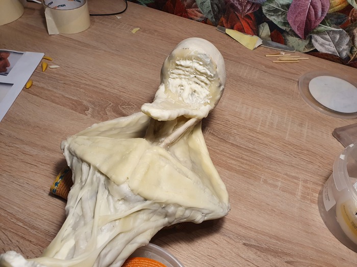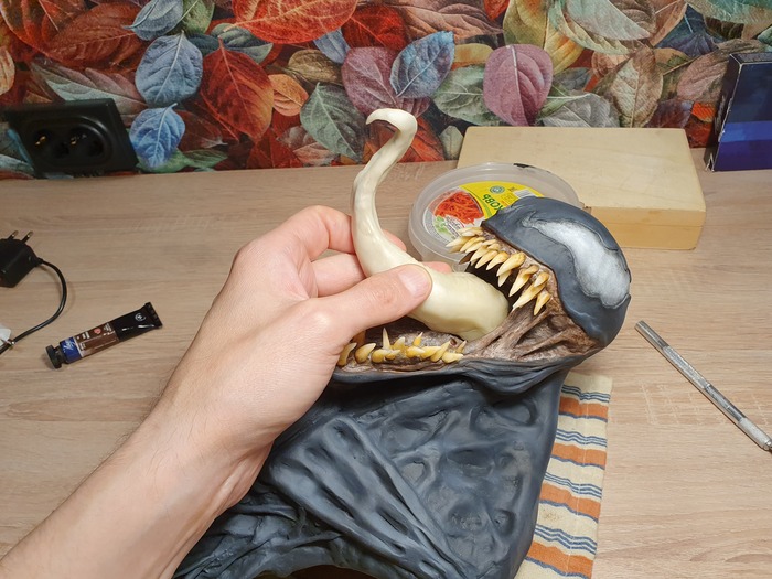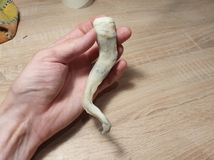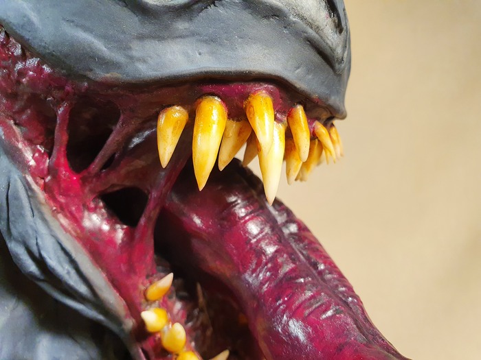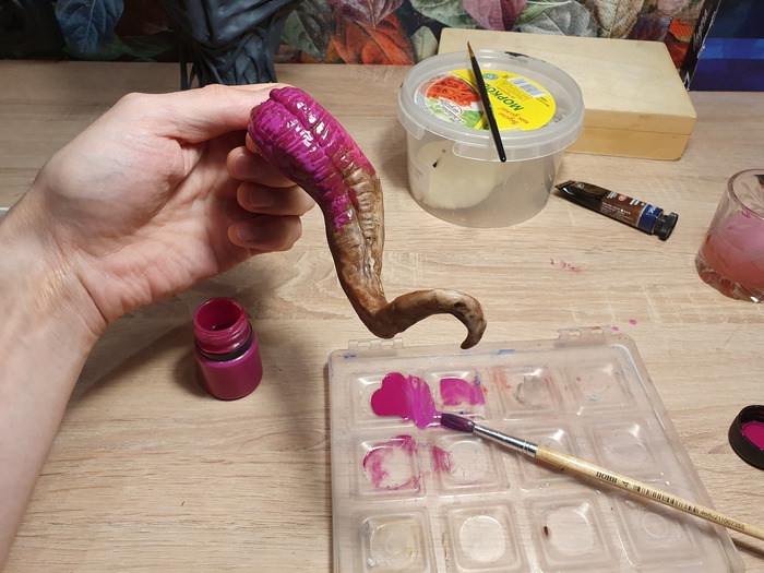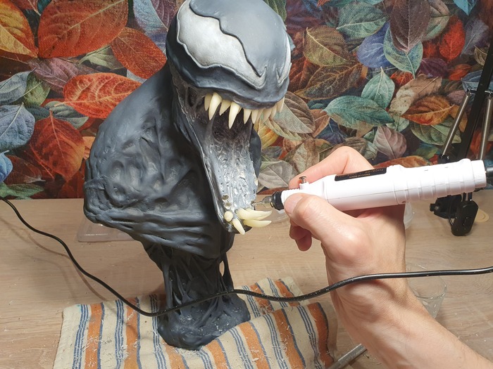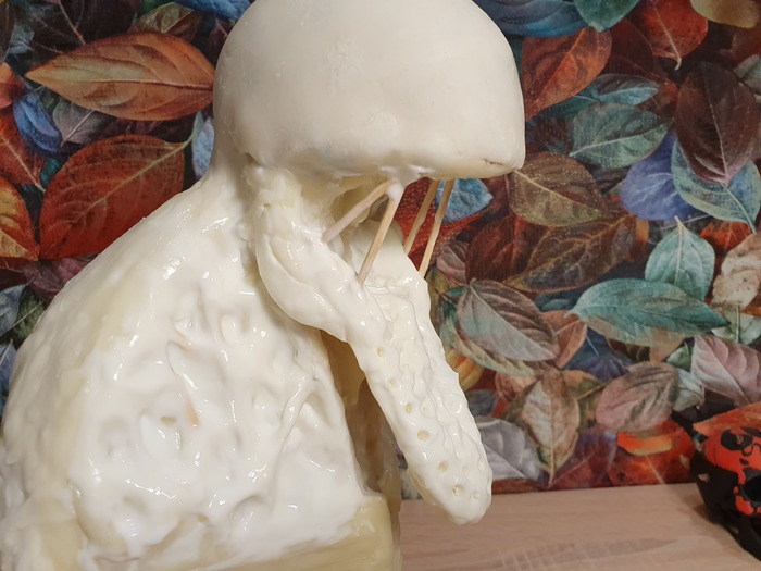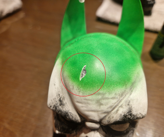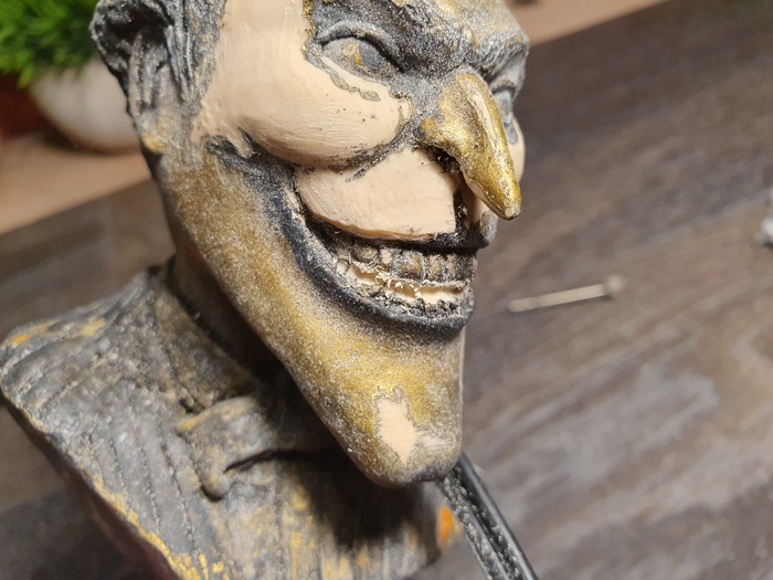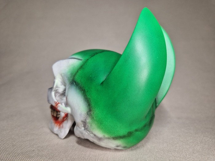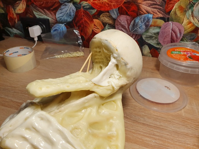 Когда работа была уже совсем закончена, а сама черепушка дожидалась фотосессии в гримёрке, одно усатоволосатое недоразумение свалило её на пол.