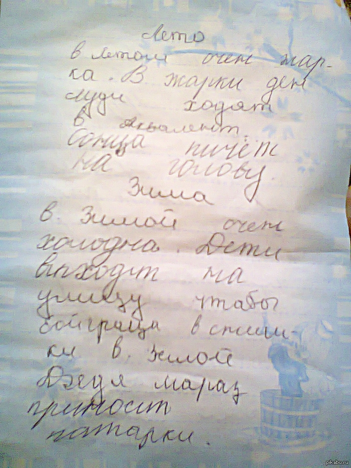 0 marzhan сочинение моей двоюродной сестренки. времена года=)) 12 лет назад нашла это сегодня пока убирала в шкафу... чуть со смеху не описалась... надеюсь вы тоже посмеетесь... [моё] Картинки и фото