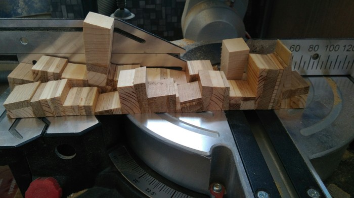 Тут придумал хитрость: чтоб детали в месте склейки были ровно друг к другу приклеены, я нарезал брусков из сосны. А чтоб они не склеивались между собой, обклеил бруски скотчем.