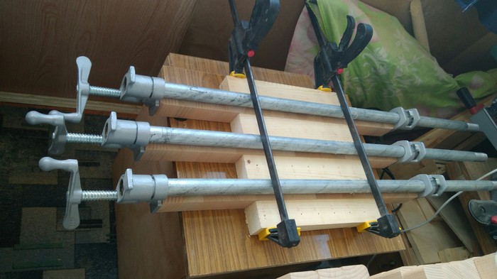 Мелкие струбцины по бокам для того, чтобы детали имели один уровень на лицевой поверхности. Ими зажат кусочек дереве на стыке деталей и как бы задает общую плоскость.