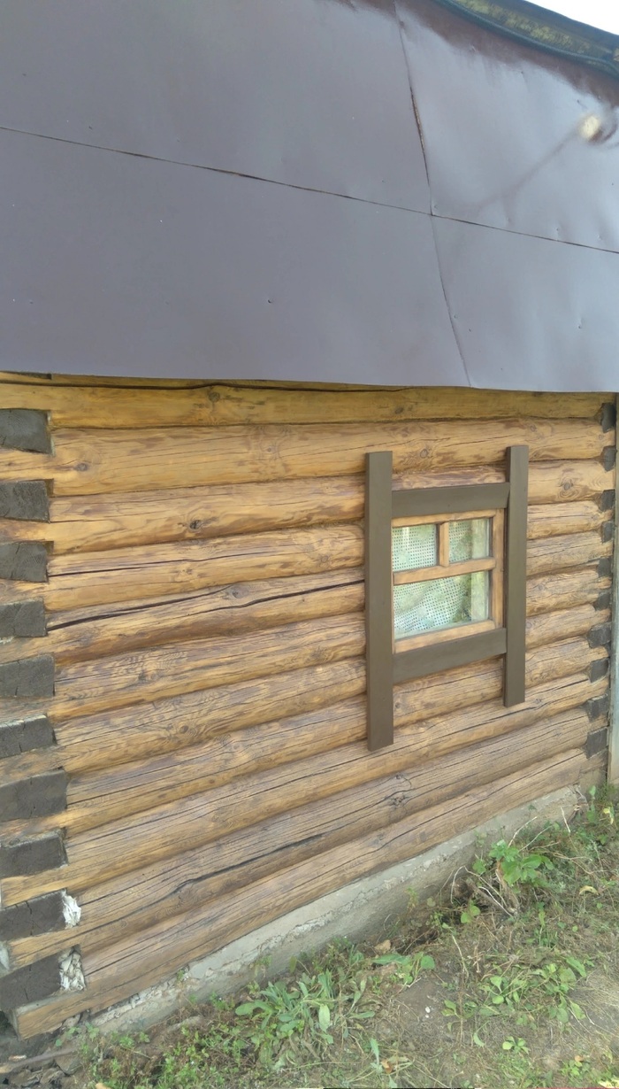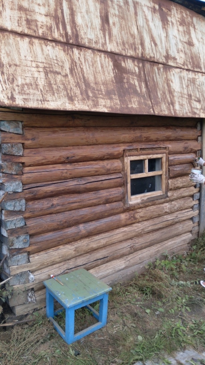 Начал ремонт с того, что отшлифовал бревно и покрыл маслом Gnature Wetterschutzöl, покрасил наличники и облезлую часть крыши (большая часть - нержавейка в норм состоянии)