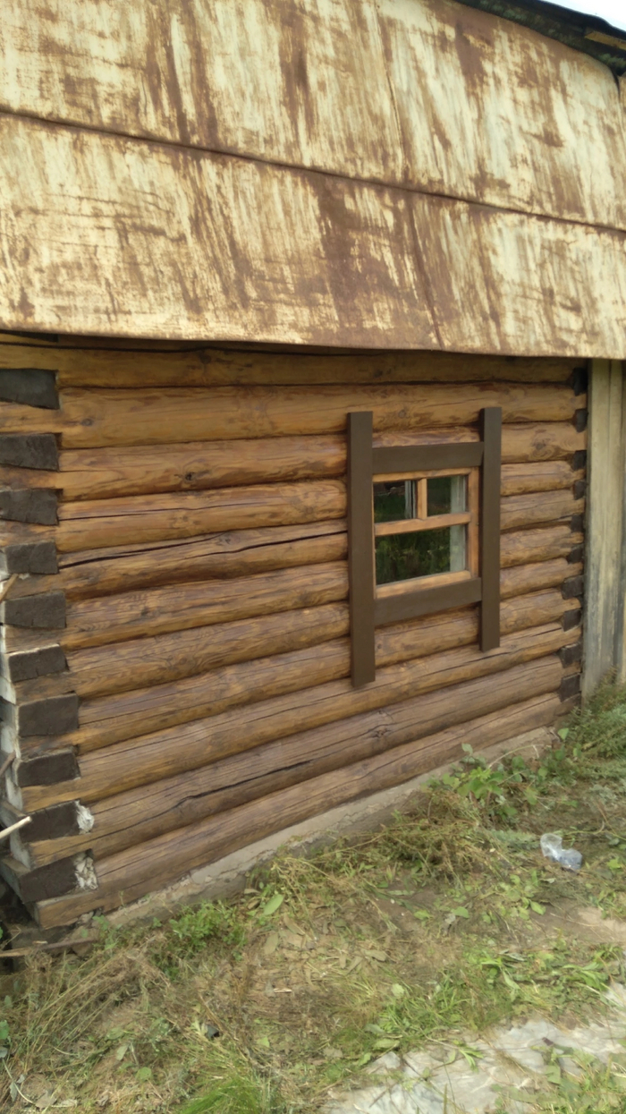 Потом покрываем всё маслом Gnature Wetterschutzöl, а торцы бревен и наличники краской Pinotex
