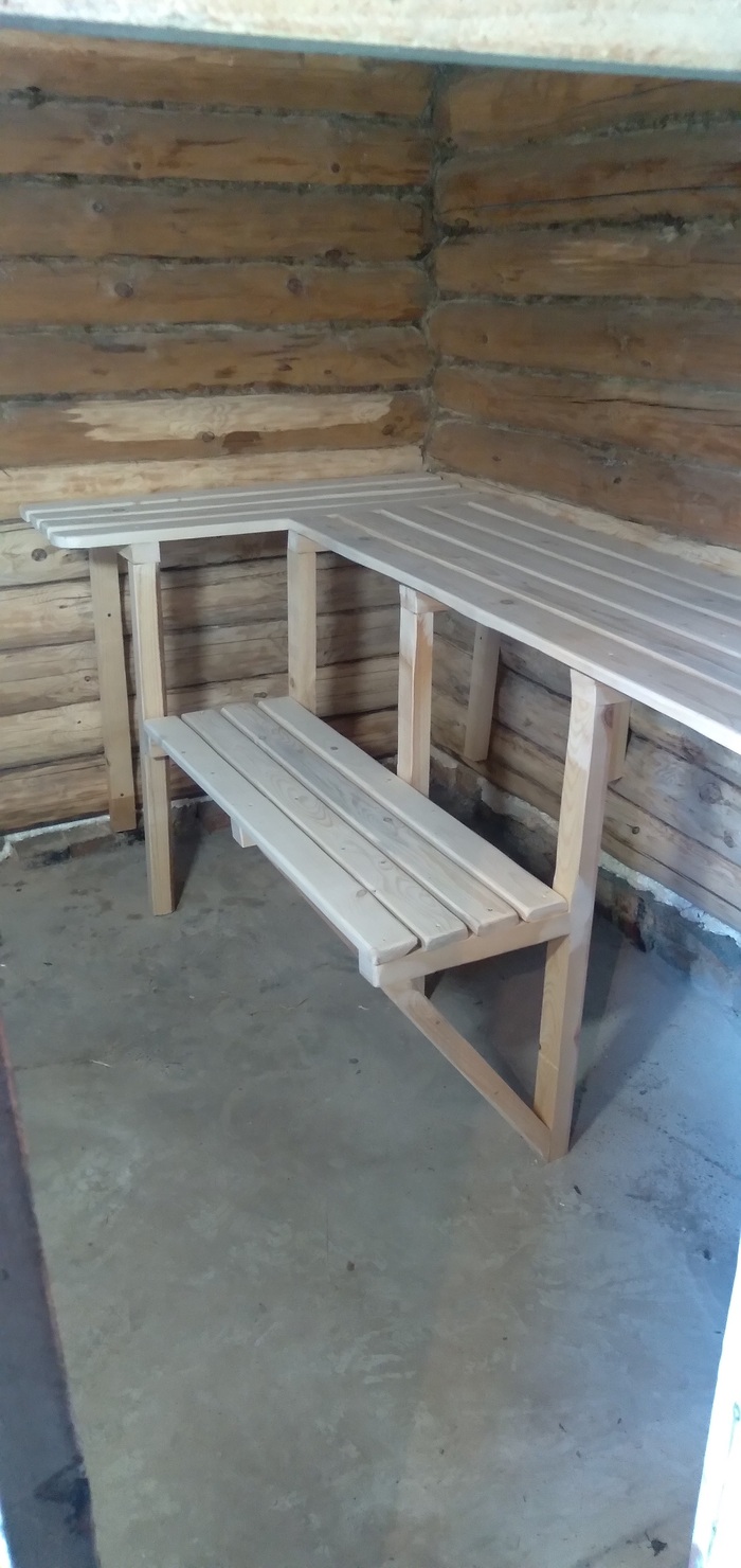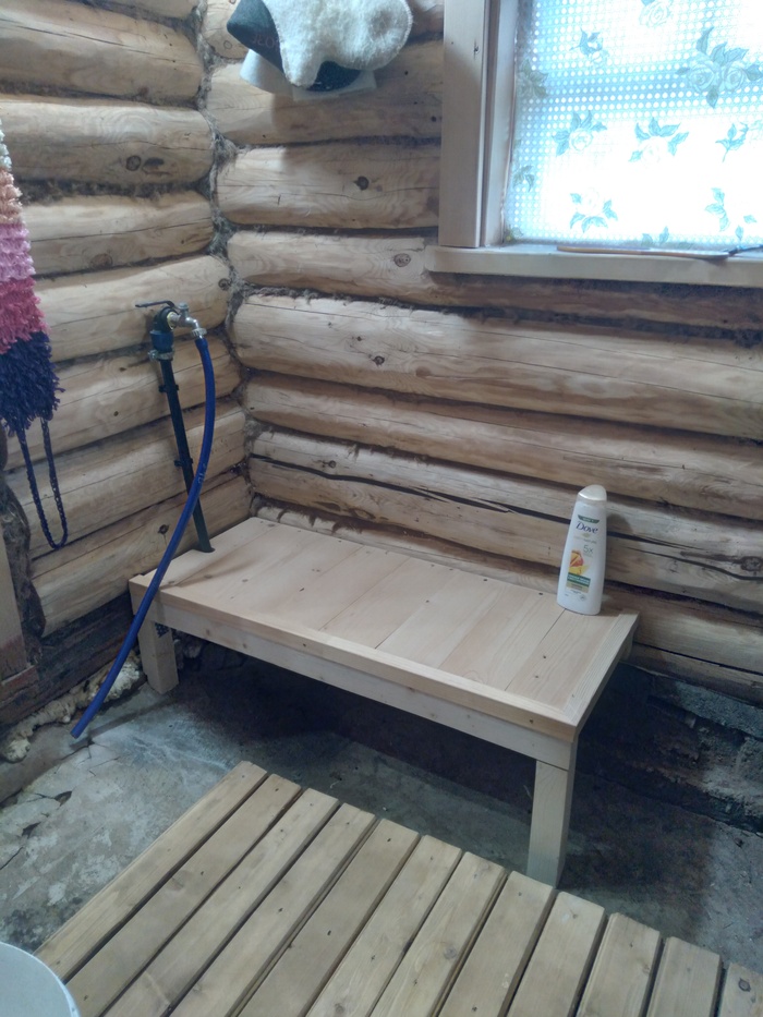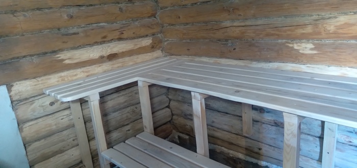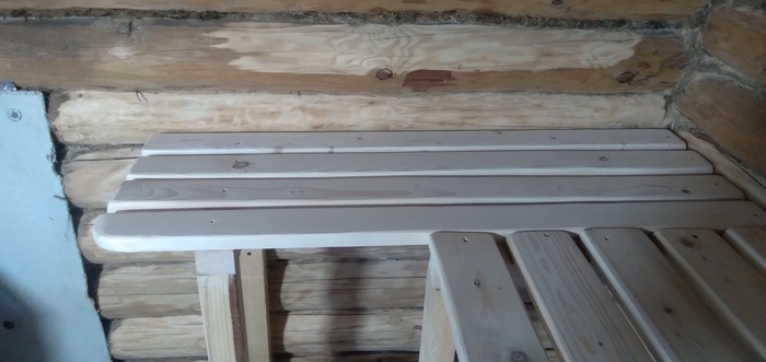 Из имевшейся 25-ой доски сделал полки, немного вкривь и вкось, но сидеть и лежать можно)