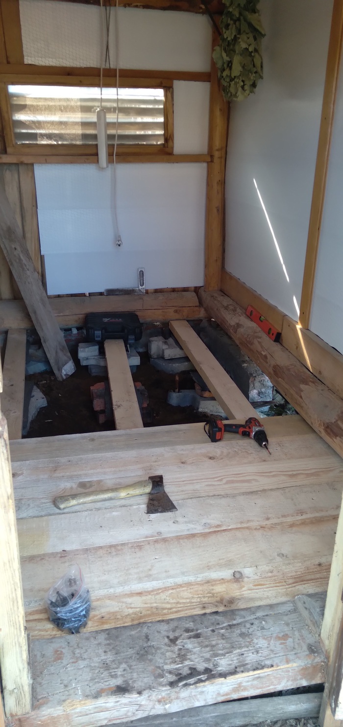 Стойки лаг пола тоже немного сместились, поэтому мы выложили их по-новой, заодно заменив одну из лаг, которая подгнила, так как частично лежала на земле.
