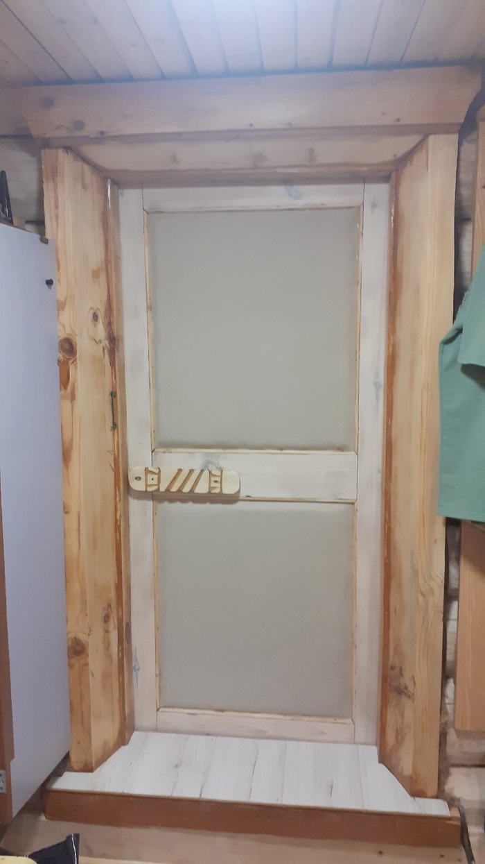 Потолок и стену обшиваю б/ушной вагонкой, провожу новую наружную проводку, обновляю дверь