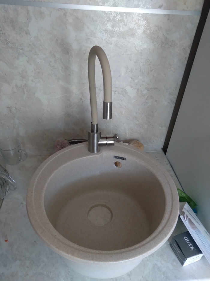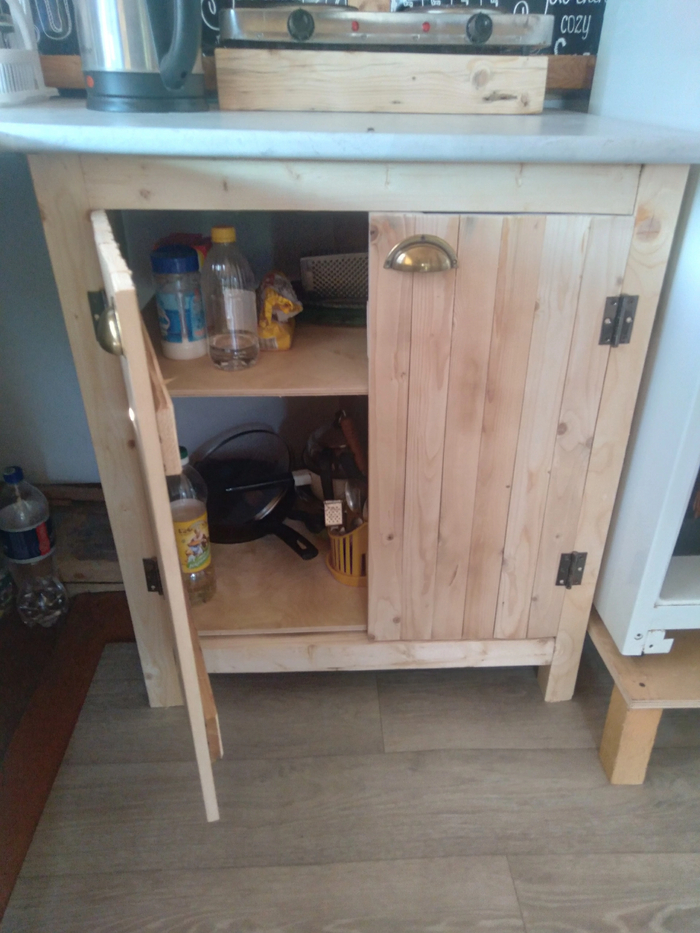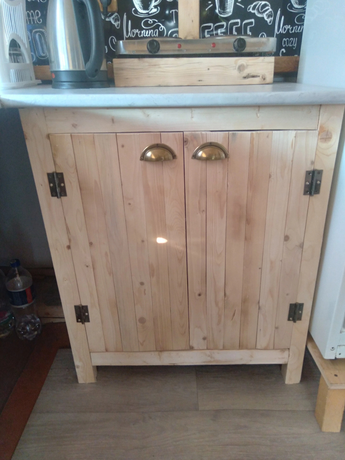Далее, заполучив за шоколадку бракованную столешницу (скол) для кухонного уголка, купил мойку со смесителем, фурнитуру для кухонных шкафчиков и собрал кухню