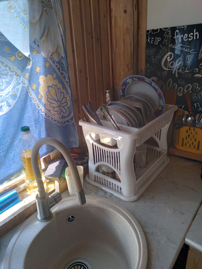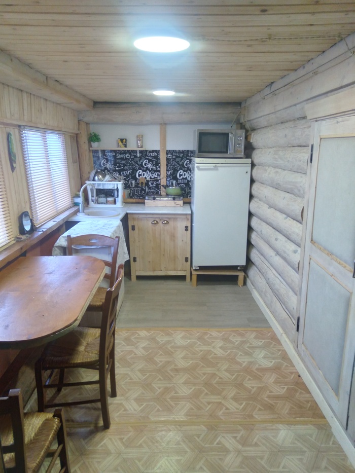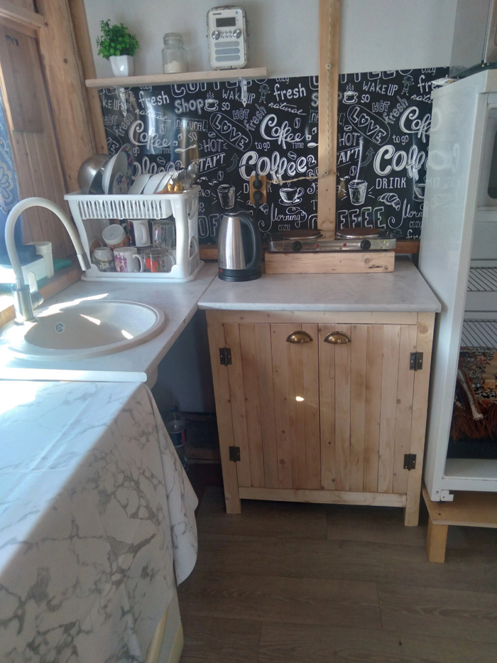 Закончив приводить в порядок жилую комнату и сруб снаружи, я приступил к кухне. Для начала я облагородил пристенный столик из кривых досок, покрытых зелёной жижей масляной краской, прикрутив сверху фанеру 10мм и покрыв её морилкой и яхтным лаком.