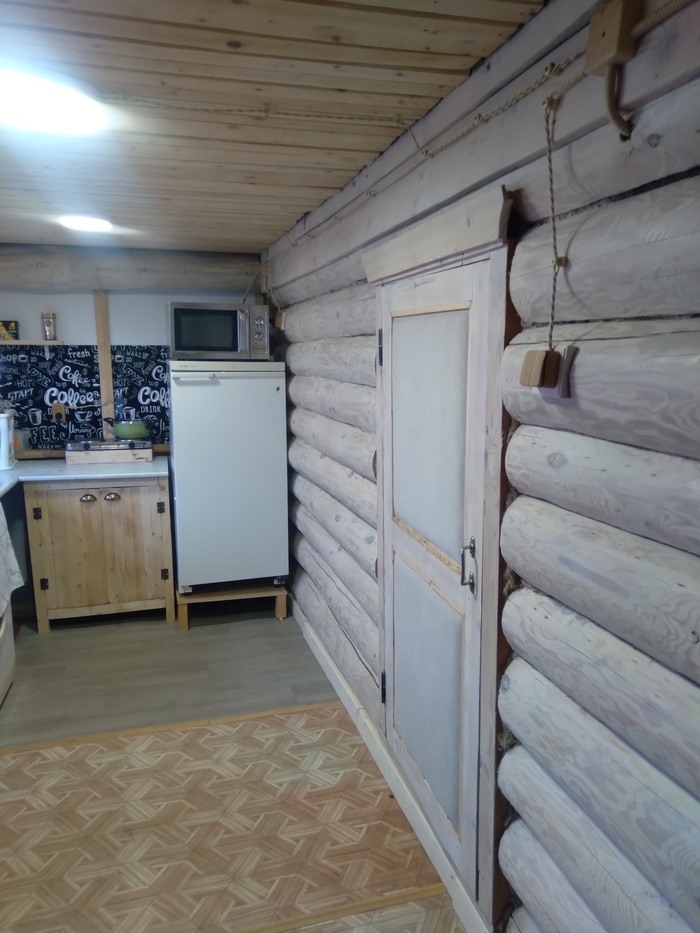 Холодильник решил поставить на пьедестал, так как во-первых он низковат, во-вторых, сзади него идёт бревно, которое съедает полезную площадь, если поставить холодильник прямо на пол