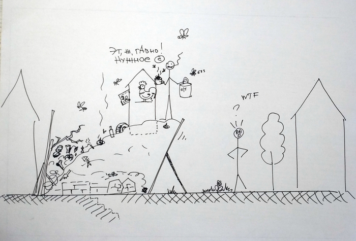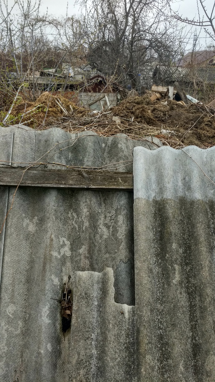 А незабвенная куча говна выросла по уровень нашего престарелого забора и закрывает куроводов ровно по щиколотку. Смотрите сами, фотка с нашего участка (рост у меня 1,8 м). Говна:
