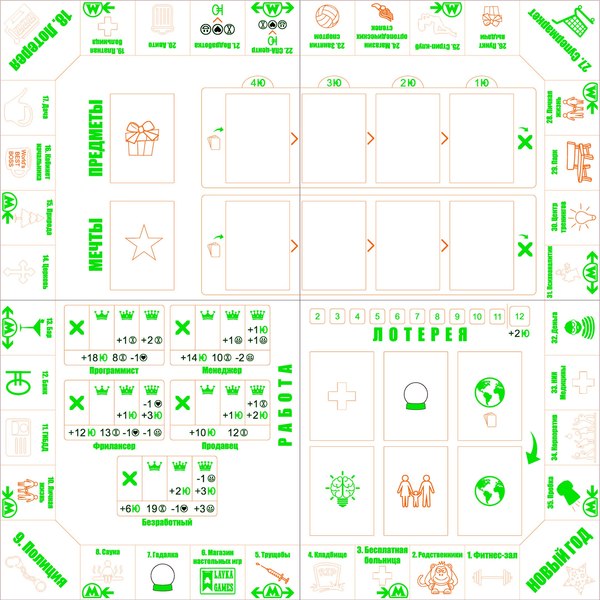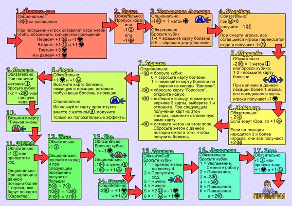 Слева работы, которые выбирают игроки, чтобы получать деньги, справа место для колод и поле лотереи, сверху игровой магазин, мечты и остальные локации. Они не особо влезли, но я верю, что вы сможете представить. У каждой локации, как уже писалось выше, есть свой уникальный или не совсем эффект. Но далеко не все эффекты было реально отобразить на поле. Решением стало создание отдельной памятки игрока и вынесение на поле просто ассоциативных картиночек. Памятка выглядела так: