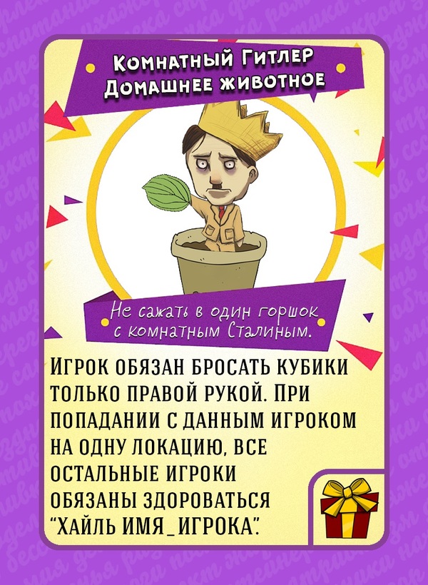 -130 карт предметов. Великое множество всякой неадекватины вроде банки шпротов, которая увеличивает мораль или сиамских хомяков-биржевиков, приносящих деньги.