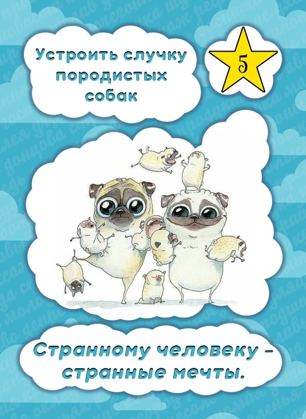 -38 карт мечты. Основной инструмент получения победных очков. Были как нормальные (заработать n денег), так и не очень (спарить двух собак).