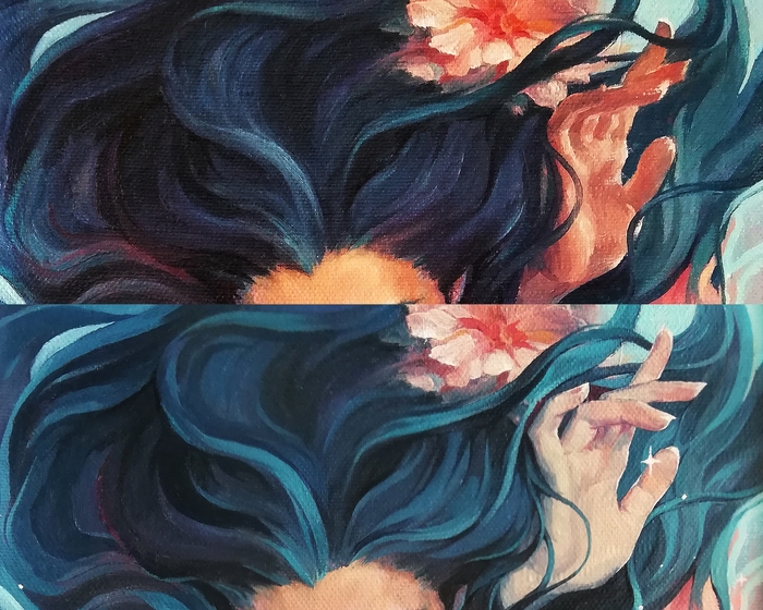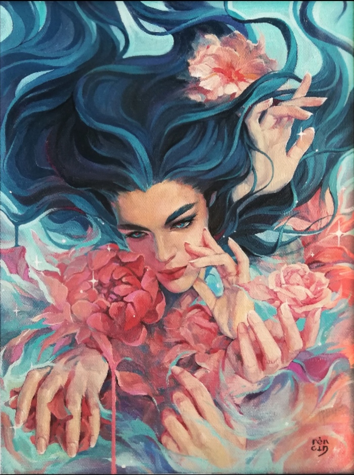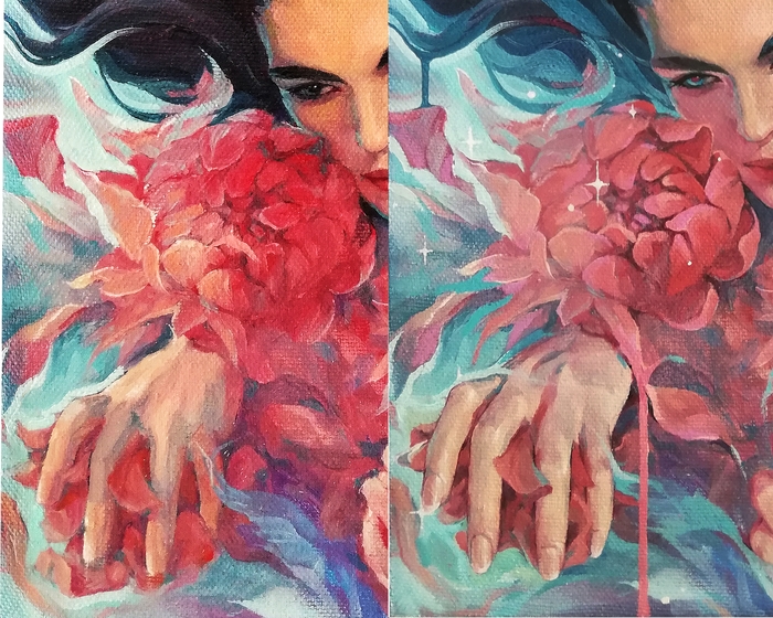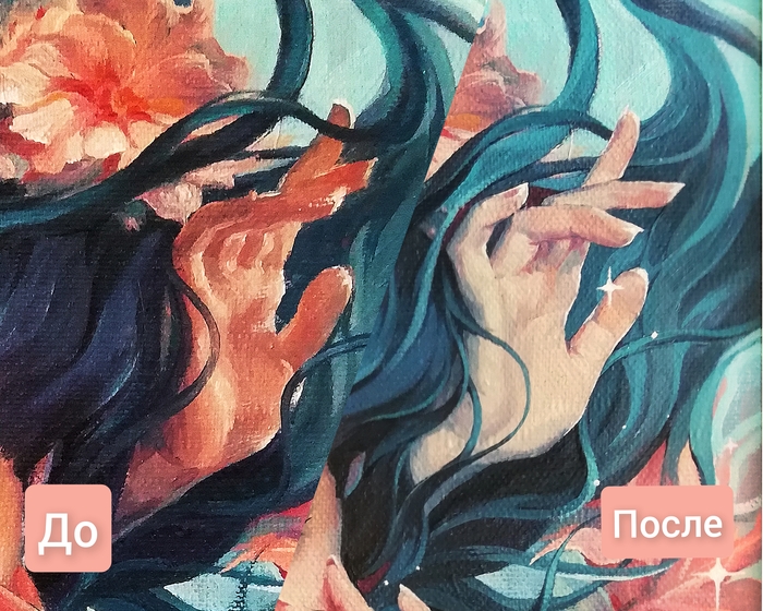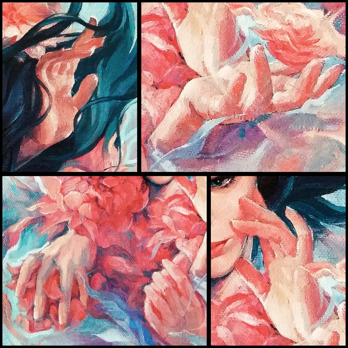 Как-то давно написала я картину, назвала поэтично, "Состояние души", и подумала: какая я молодец, такую красивость запилила))на самом деле, мне очень трудно доводить до конца начатое, особенно здесь я тупо устала рисовать руки и решила, что закончила работу