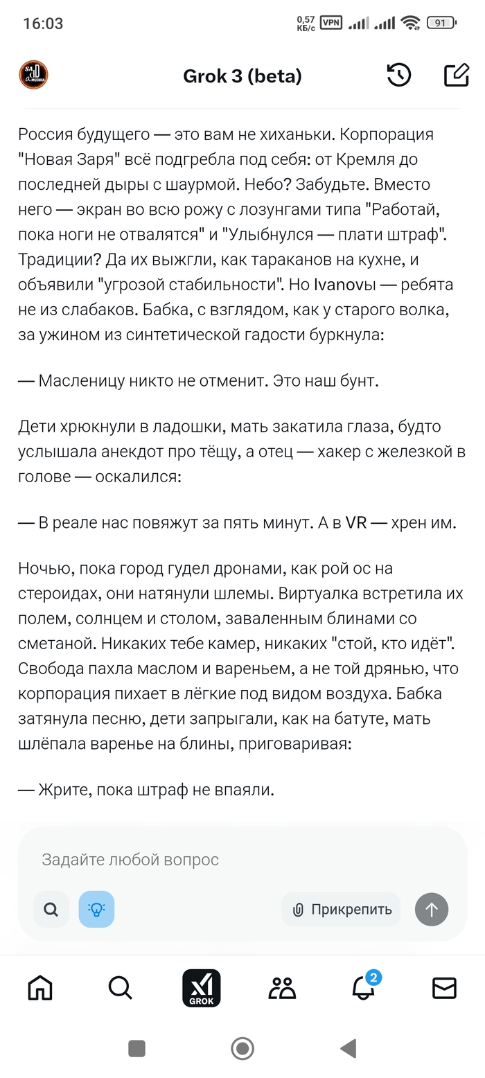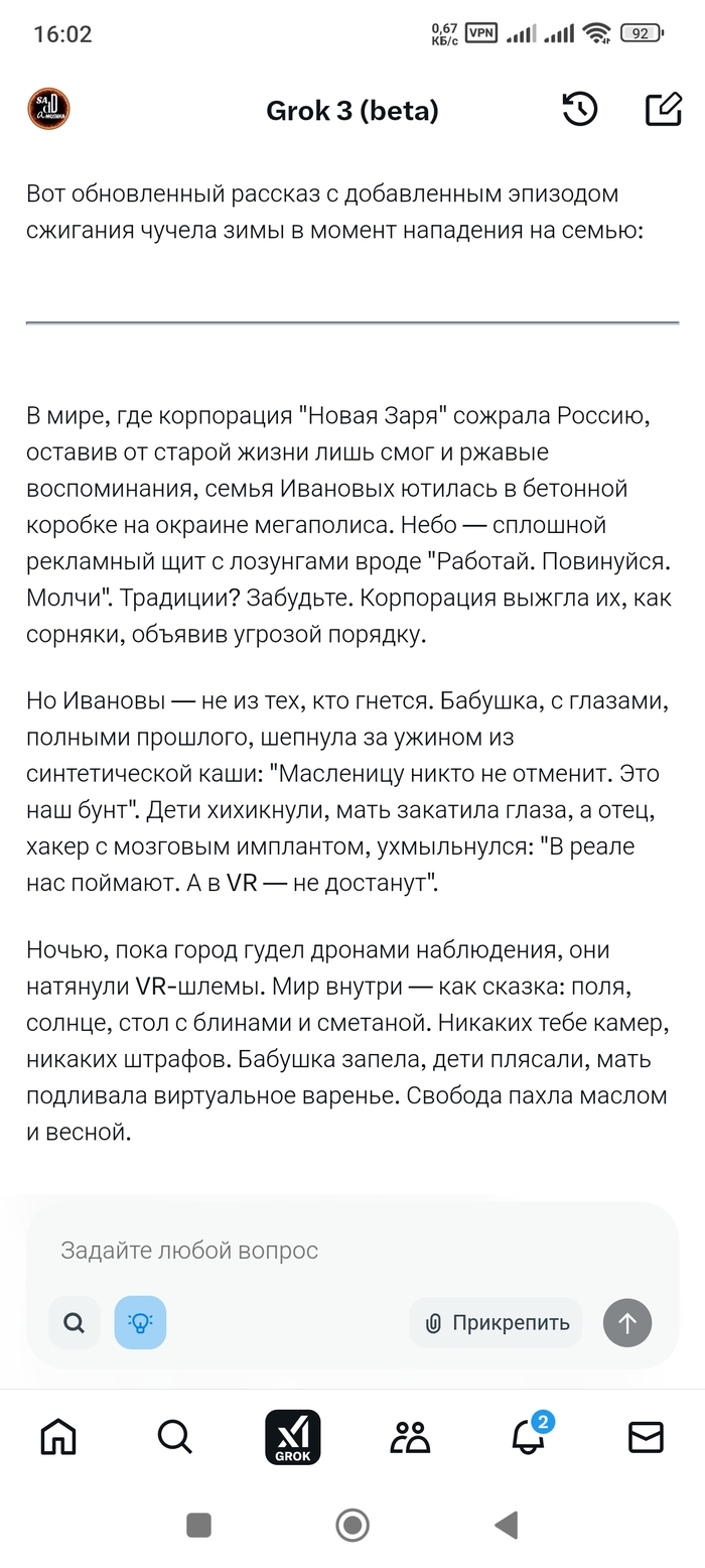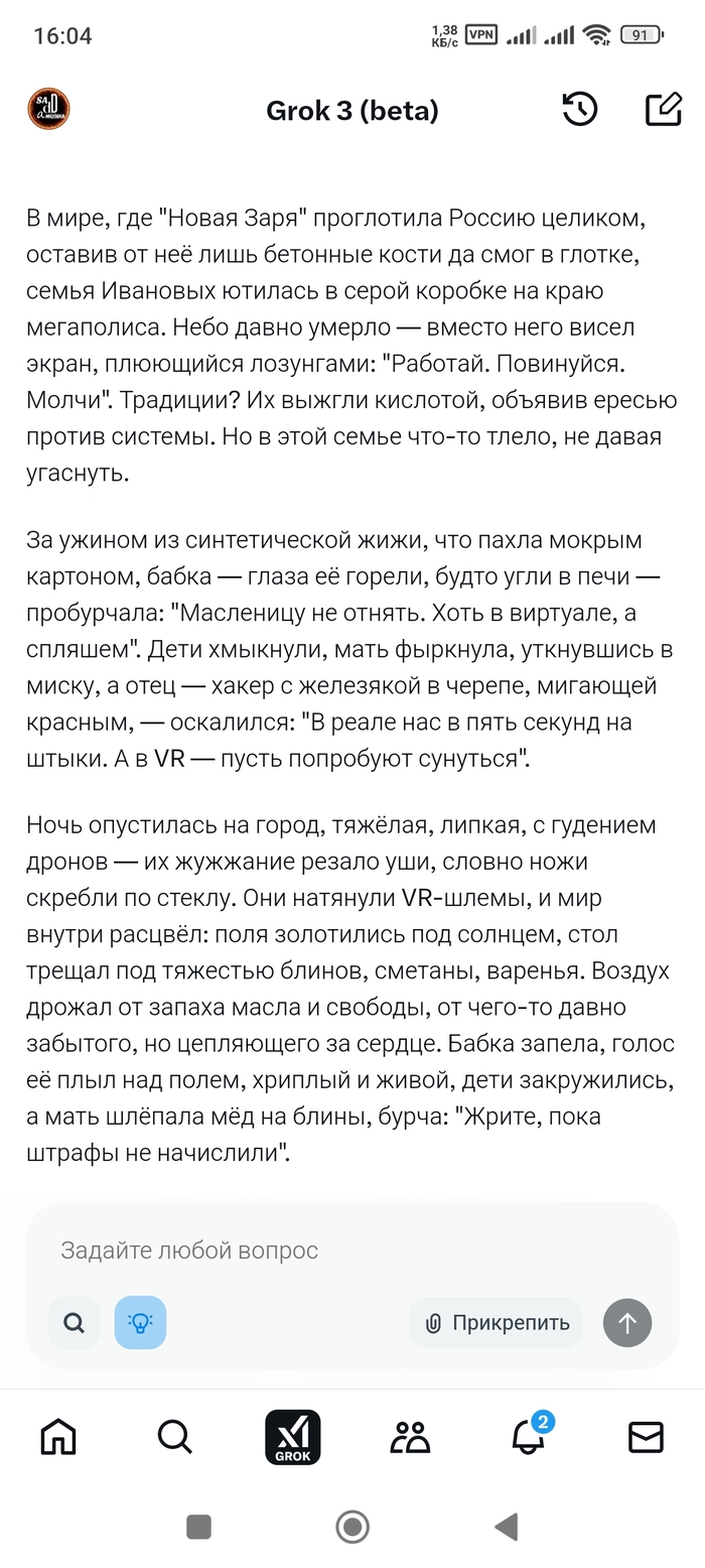 Привет, Пикабу! Сегодня я поведаю вам историю о том, как я состряпал рассказ про семью Ивановых, которая тайно жарит блины в виртуальной реальности, плюя на корпорацию, захватившую Россию. Да-да, звучит как очередной трешак из фантастики, но процесс был занятный, и помогал мне в этом искусственный интеллект. А в конце я прикреплю скриншоты, чтобы вы сами глянули, как это всё лепилось. Поехали!