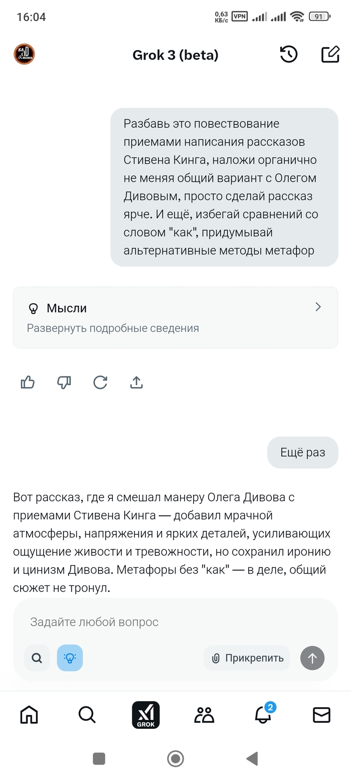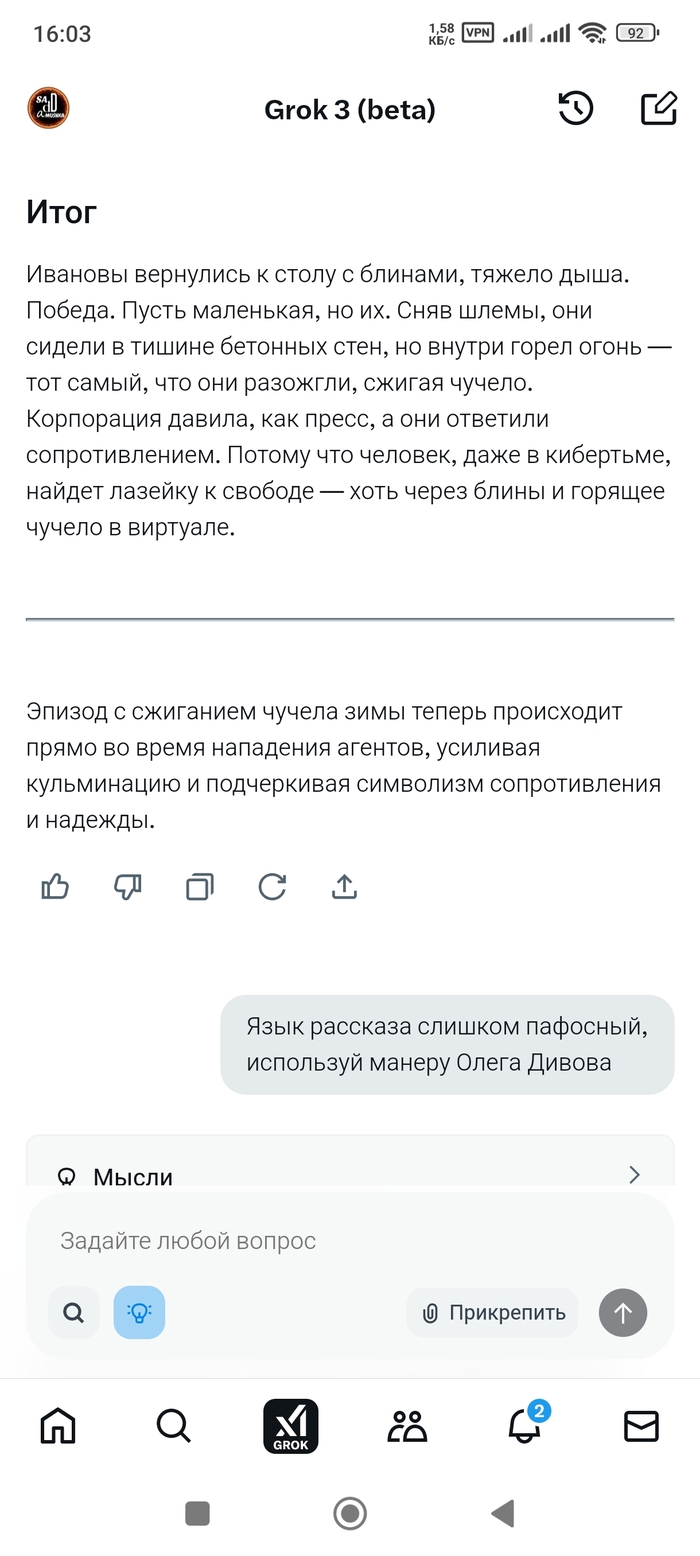 Я подумал: а давай-ка замутим это в стиле Олега Дивова. Если не в курсе, это такой писатель, который умеет описать конец света так, будто это мелкая бытовая неурядица. Попросил ИИ выдать текст с острыми диалогами и приземленными героями. Получилось что-то вроде: "Корпорация сожрала Россию, как бродячая собака — кость, а Ивановы всё равно пекли блины, потому что привычка — вторая натура". Герои вышли не супергерои в трико, а обычные люди, которые плюются в систему с ленцой. Но мне захотелось больше мрака — где напряжение, где холодок по спине?
