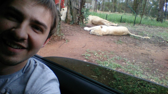 Львица, лежавшая в траве, позже приняла позу, в которой обычный домашние кошки поджидают мышь, сфокусировалась на мне, привстала и побежала за нами. Мы то еле плелись, этому русскому же надо сделать селфи... в общем я, быстрым движением программистской руки, закрыл окошко, и мама дала газу. Потом мне рассказали, что они могут вцепиться в колесо и проколоть его, сесть на крышу и ждать.