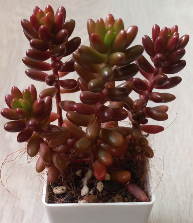 Очиток красноокрашеный. Очень яркий и красивый на солнце. Блестящий и глянцевый до невозможности! А нитки вокруг него - воздушные корни.