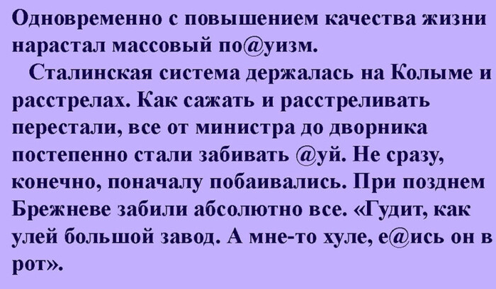 Родившимся уже в самом конце восьмидесятых трудно объяснить до какой степени в совке ни@уя не было. Я в 1984- 89 г.г. бывал в командировках в Венгрии и Чехословакии и, что видел там, казалось мне, как и прочим выездным советским гражданам, сказочным изобилием. Сами венгры и чехи на наши восхищения усмехались и отвечали, что это мы ФРГ и Австрию не видели. Приводил ранее цитату обладательницы самого старого мирового рекорда в лёгкой атлетике чешки Ярмилы Кратохвиловой о её первом посещении ФРГ. А у Владимира Семёновича, со слов Марины Влади, при первом заезде в Западный Берлин и вовсе истерика случилась.