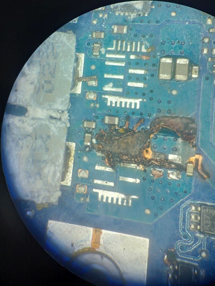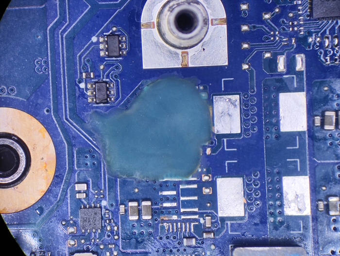И теперь приступаем к самой интересной части, выпиливаем прогар (кстати говоря, тоже типовая неисправность данных ноутов, на каждом втором таком ноутбуке, который приносили просто в обслуживание - уже был прогар по этой зоне, но ноутбук продолжал работать без сгоревшей фазы) , чтобы оценить масштаб повреждений: