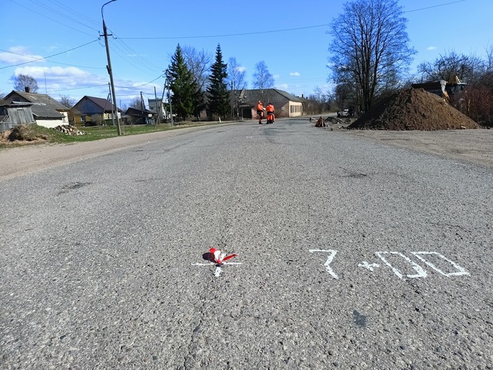 Дорогу размечаем буквально вдоль и поперек. Используем краску, дюбеля, колышки, репера. Фиксируем длину, ширину, высоту, координаты. Чем чаще, тем лучше. Дальше приступаем к геодезической съемке, по результатам которой будем составлять уже реальный проект для нашего ремонта. Преодолеваем муторно-кропотливый, но творческий процесс, сложность которого в увязке объемов заказчика с фактическим состоянием дороги. Как правило объемы выделяют мизерные и нужно ухитриться, так сказать, натянуть «сову на глобус». Представьте, что в асфальтовом покрытии нужно убрать множественные провалы, выбоины и колеи, которые превышают по высоте порядка 20см, а выделяются на ремонт объемы в пределах 10см…. И с учётом стоимости асфальта просчеты на этом этапе могут очень дорого обойтись подрядчику…
